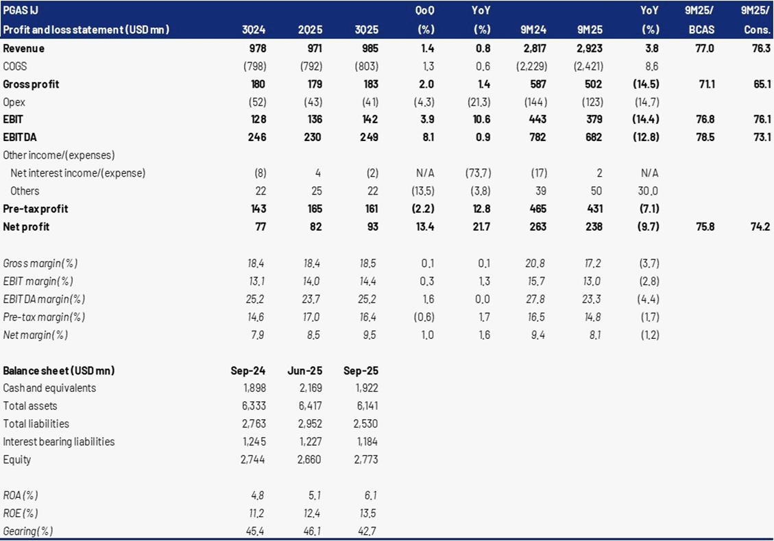 - PGAS posted a solid 3Q25 revenue of USD 985mn (+1.4% QoQ, +0.8% YoY), supported by higher gas trading volumes at c.835 bbtud (+4.0% QoQ) and steady upstream output of 17,213 mmscfd (+0.6% QoQ), bringing 9M25 revenue to USD 2,923mn (+3.8% YoY), in line with our estimate (77.0%) and consensus (76.3%).
