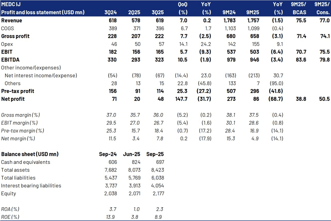 - Supported by topline improvement, 3Q25 bottom-line margin improved to 9.5% (+100 bps QoQ, +160 bps YoY), driving net profit to USD 93mn (+13.4% QoQ, +21.7% YoY), partly driven by lower minority interest. However, 9M25 net profit remained weak at USD 238mn (-9.7% YoY), in line with our forecast (75.8%) but slightly below consensus (74.2%).