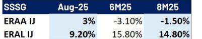 - ERAA booked Aug-25 SSSG at +3.0%, bringing 8M25 to -1.5% (vs -3.1% in 1H25). ERAL maintained strong momentum with +9.2% SSSG, lifting 8M25 to +14.8%.