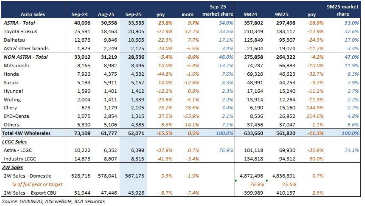 - Non-Astra brands showed declining mom sales, only Chery and Hyundai that increasing. 4W wholesales dropped 15.5% yoy and flat +0.5% mom in Sep-25.